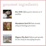 Deionized Water, Behentrimonium Methosulfate (BTMS), Cetearyl Alcohol, Persea Gratissima (Avocat) Oil, Oryza Sativa (Riz) Bran Oil, Aloe Barbadensis Leaf Juice, Ricinus Communis (Ricin) Seed Oil, Macadamia Ternifolia (Macadamia) Seed Oil, Sorbitol, Camellia Sinensis (Thé vert) Leaf Extract, Oryza Sativa (Riz) Milk, Rosa Canina (Rose musquée du Chili) Fruit Oil, Ceteareth-20, UlmusFulva (Orme rouge) Bark Extract, Phenoxyethanol (OptiphenND), Caprylyl Glycol, Parfum sans phtalates Phthalate, et de l’amour!